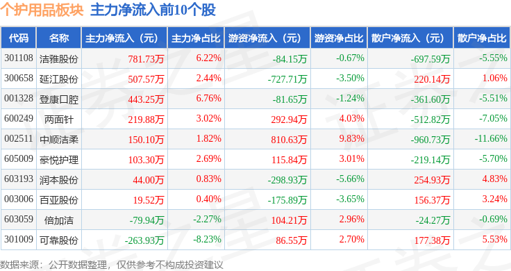 从资金流向上来看,当日个护用品板块主力资金净流出119.25万元,游资资金净流出932.44万元,散户资金净流入1051.69万元。个护用品板块个股资金流向见下表: