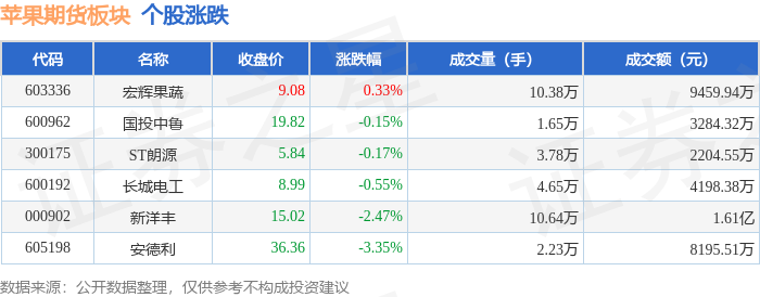 证券之星消息,12月9日苹果期货板块较上一交易日下跌1.75%,安德利领跌。当日上证指数报收于3909.52,下跌0.37%。深证成指报收于13277.36,下跌0.39%。苹果期货板块个股涨跌见下表: