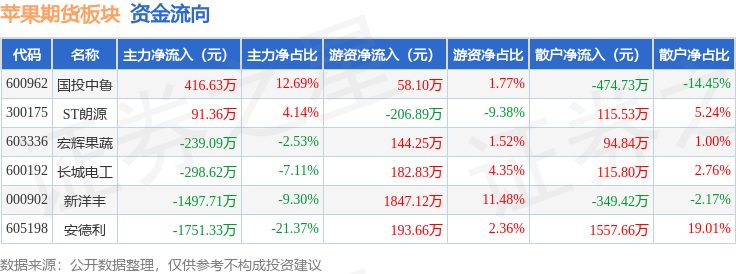 从资金流向上来看,当日苹果期货板块主力资金净流出3278.76万元,游资资金净流入2219.07万元,散户资金净流入1059.69万元。苹果期货板块个股资金流向见下表: