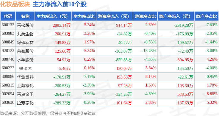 从资金流向上来看,当日化妆品板块主力资金净流出8817.78万元,游资资金净流入3313.67万元,散户资金净流入5504.1万元。化妆品板块个股资金流向见下表: