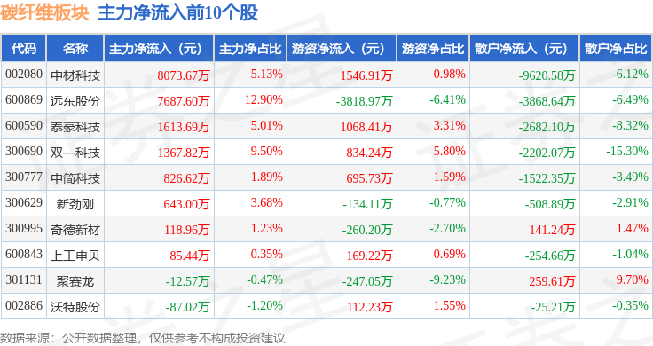 从资金流向上来看,当日碳纤维板块主力资金净流出6.2亿元,游资资金净流入6400.49万元,散户资金净流入5.56亿元。碳纤维板块个股资金流向见下表: