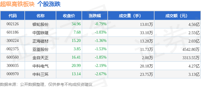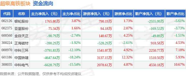 从资金流向上来看,当日超级高铁板块主力资金净流出1.37亿元,游资资金净流入7253.58万元,散户资金净流入6454.61万元。超级高铁板块个股资金流向见下表: