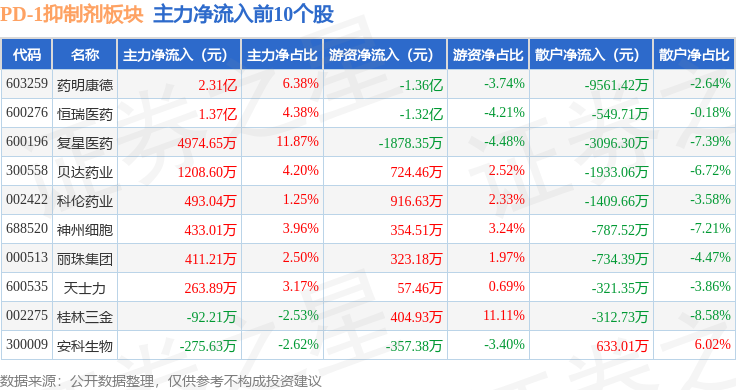 从资金流向上来看,当日PD-1抑制剂板块主力资金净流入3.38亿元,游资资金净流出2.05亿元,散户资金净流出1.34亿元。PD-1抑制剂板块个股资金流向见下表: