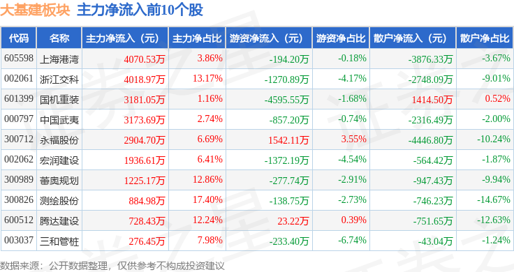 从资金流向上来看,当日大基建板块主力资金净流出18.09亿元,游资资金净流入6.13亿元,散户资金净流入11.95亿元。大基建板块个股资金流向见下表: