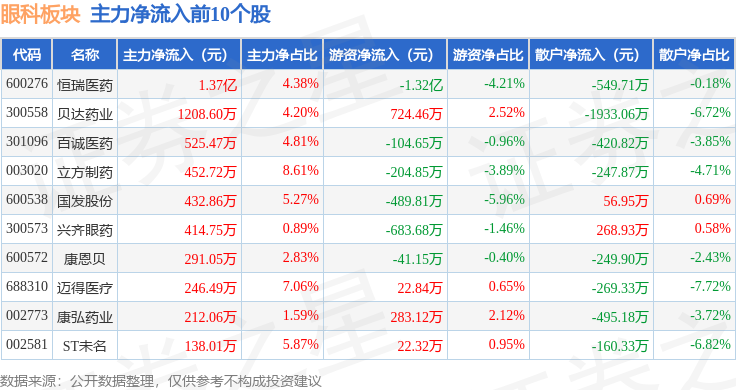 从资金流向上来看,当日眼科板块主力资金净流出5.47亿元,游资资金净流入1716.13万元,散户资金净流入5.3亿元。眼科板块个股资金流向见下表: