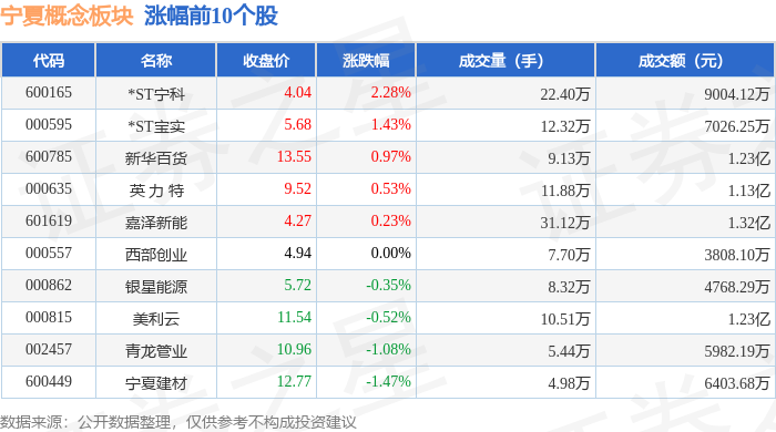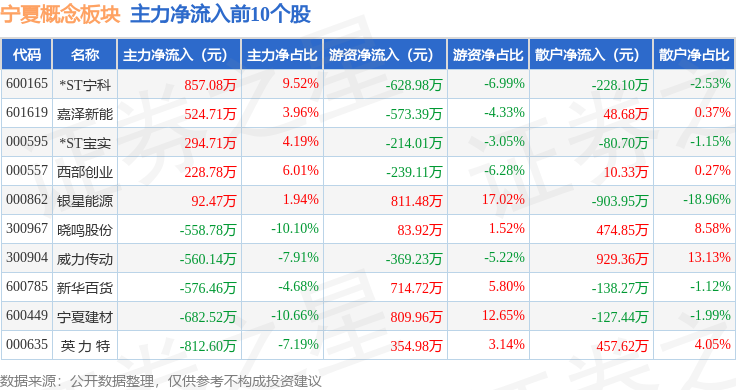 从资金流向上来看,当日宁夏概念板块主力资金净流出1.75亿元,游资资金净流入3870.75万元,散户资金净流入1.36亿元。宁夏概念板块个股资金流向见下表: