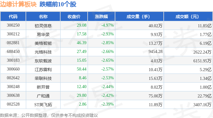 证券之星消息,12月9日边缘计算板块较上一交易日下跌0.34%,初灵信息领跌。当日上证指数报收于3909.52,下跌0.37%。深证成指报收于13277.36,下跌0.39%。边缘计算板块个股涨跌见下表: