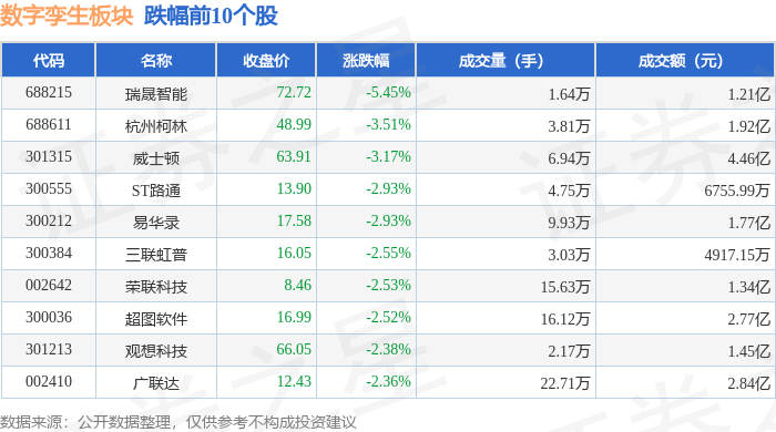证券之星消息,12月9日数字孪生板块较上一交易日下跌0.88%,瑞晟智能领跌。当日上证指数报收于3909.52,下跌0.37%。深证成指报收于13277.36,下跌0.39%。数字孪生板块个股涨跌见下表:
