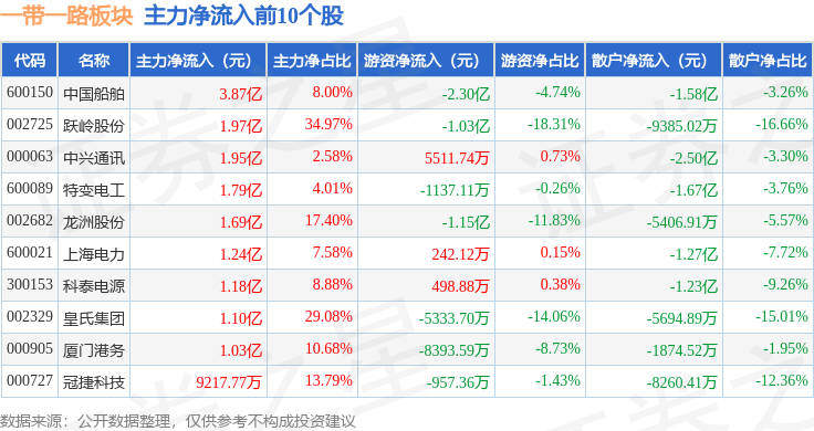 从资金流向上来看,当日一带一路板块主力资金净流出111.99亿元,游资资金净流入22.39亿元,散户资金净流入89.6亿元。一带一路板块个股资金流向见下表: