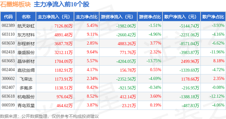 从资金流向上来看,当日石墨烯板块主力资金净流出16.01亿元,游资资金净流入9514.81万元,散户资金净流入15.06亿元。石墨烯板块个股资金流向见下表: