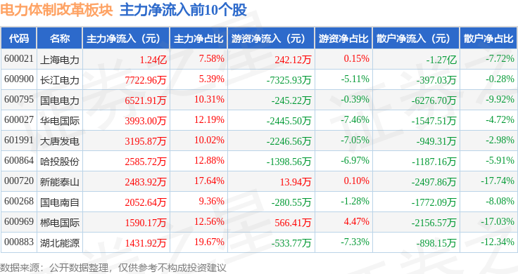 从资金流向上来看,当日电力体制改革板块主力资金净流出4831.57万元,游资资金净流入1.06亿元,散户资金净流出5778.1万元。电力体制改革板块个股资金流向见下表: