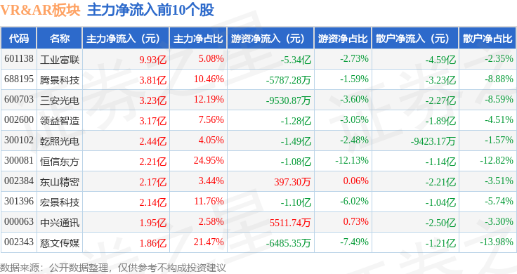 从资金流向上来看,当日VR&AR板块主力资金净流出21.02亿元,游资资金净流入2.69亿元,散户资金净流入18.33亿元。VR&AR板块个股资金流向见下表: