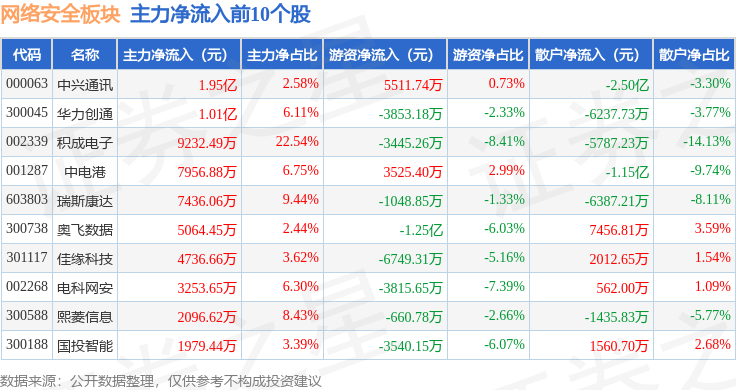从资金流向上来看,当日网络安全板块主力资金净流出39.62亿元,游资资金净流入9056.99万元,散户资金净流入38.71亿元。网络安全板块个股资金流向见下表: