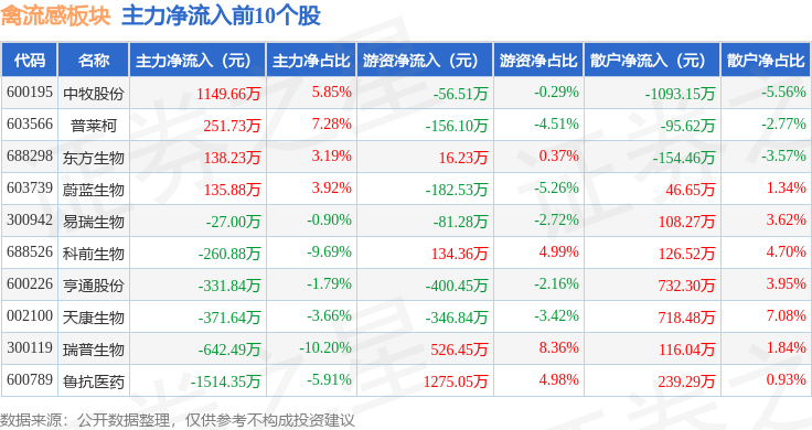 从资金流向上来看,当日禽流感板块主力资金净流出4675.09万元,游资资金净流入2460.47万元,散户资金净流入2214.62万元。禽流感板块个股资金流向见下表: