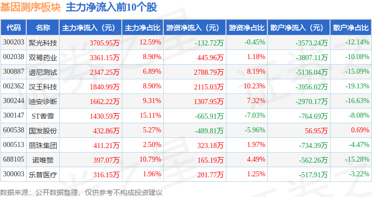 从资金流向上来看,当日基因测序板块主力资金净流出2.43亿元,游资资金净流入6959.63万元,散户资金净流入1.74亿元。基因测序板块个股资金流向见下表: