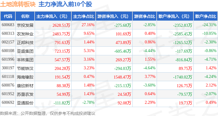 从资金流向上来看,当日土地流转板块主力资金净流出3.32亿元,游资资金净流入1.11亿元,散户资金净流入2.22亿元。土地流转板块个股资金流向见下表: