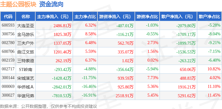 从资金流向上来看,当日主题公园板块主力资金净流出5261.48万元,游资资金净流入4403.23万元,散户资金净流入858.25万元。主题公园板块个股资金流向见下表: