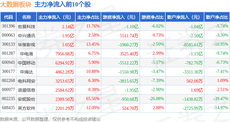 从资金流向上来看,当日大数据板块主力资金净流出102.28亿元,游资资金净流入7.36亿元,散户资金净流入94.92亿元。大数据板块个股资金流向见下表: