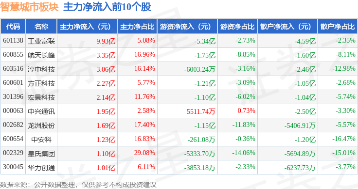 从资金流向上来看,当日智慧城市板块主力资金净流出44.33亿元,游资资金净流出12.15亿元,散户资金净流入56.48亿元。智慧城市板块个股资金流向见下表: