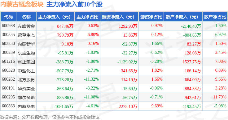 从资金流向上来看,当日内蒙古概念板块主力资金净流出7.75亿元,游资资金净流入6784.83万元,散户资金净流入7.07亿元。内蒙古概念板块个股资金流向见下表: