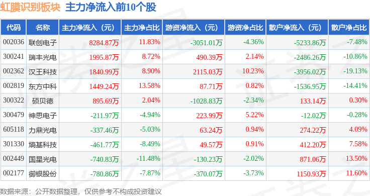 从资金流向上来看,当日虹膜识别板块主力资金净流出2.84亿元,游资资金净流入5964.9万元,散户资金净流入2.24亿元。虹膜识别板块个股资金流向见下表: