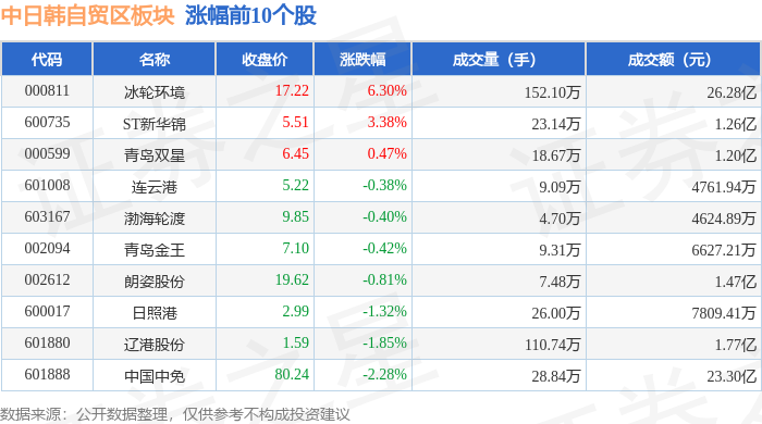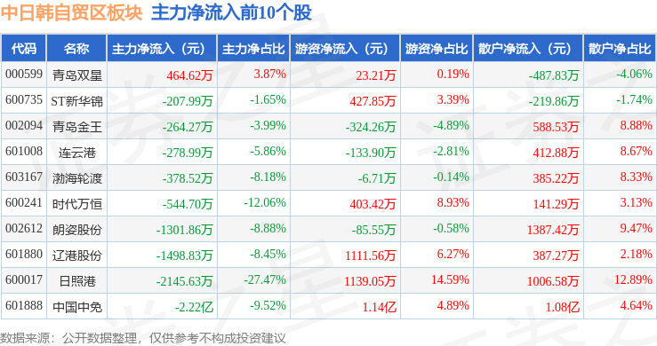 从资金流向上来看,当日中日韩自贸区板块主力资金净流出5.25亿元,游资资金净流入1.35亿元,散户资金净流入3.9亿元。中日韩自贸区板块个股资金流向见下表: