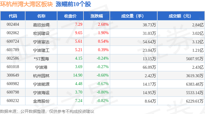 证券之星消息,12月9日环杭州湾大湾区板块较上一交易日下跌1.11%,荣安地产领跌。当日上证指数报收于3909.52,下跌0.37%。深证成指报收于13277.36,下跌0.39%。环杭州湾大湾区板块个股涨跌见下表: