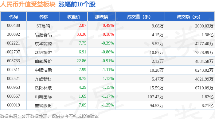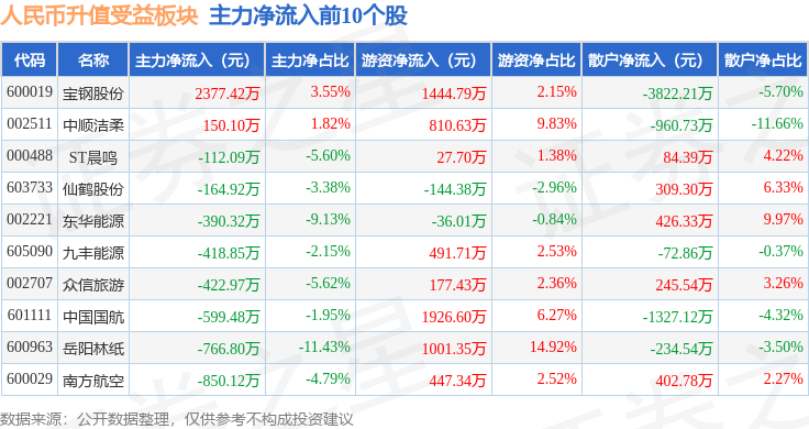 从资金流向上来看,当日人民币升值受益板块主力资金净流出9.41亿元,游资资金净流入4.29亿元,散户资金净流入5.12亿元。人民币升值受益板块个股资金流向见下表: