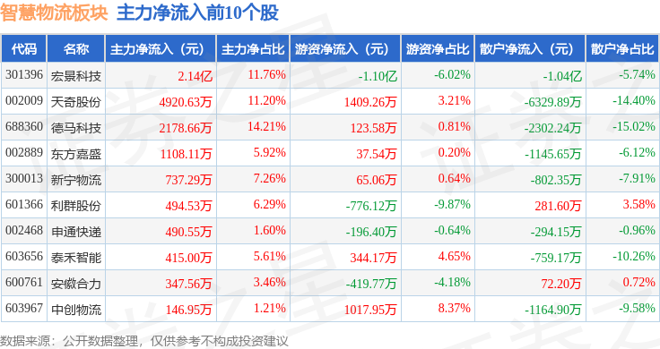 从资金流向上来看,当日智慧物流板块主力资金净流出12.83亿元,游资资金净流入8250.0万元,散户资金净流入12.0亿元。智慧物流板块个股资金流向见下表: