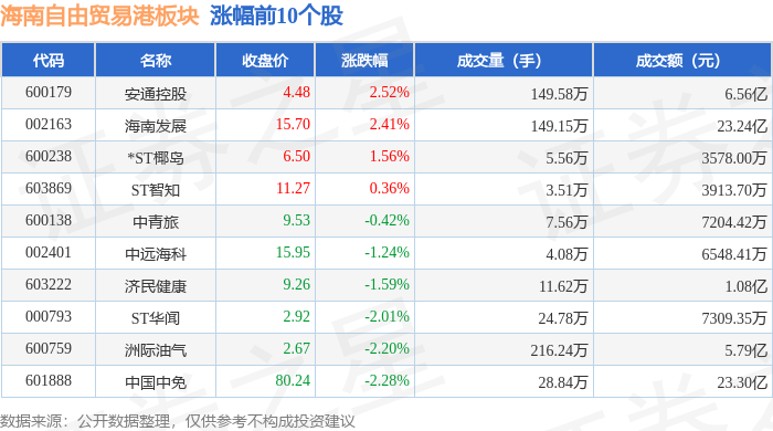 从资金流向上来看,当日海南自由贸易港板块主力资金净流出12.76亿元,游资资金净流入4.83亿元,散户资金净流入7.93亿元。海南自由贸易港板块个股资金流向见下表: