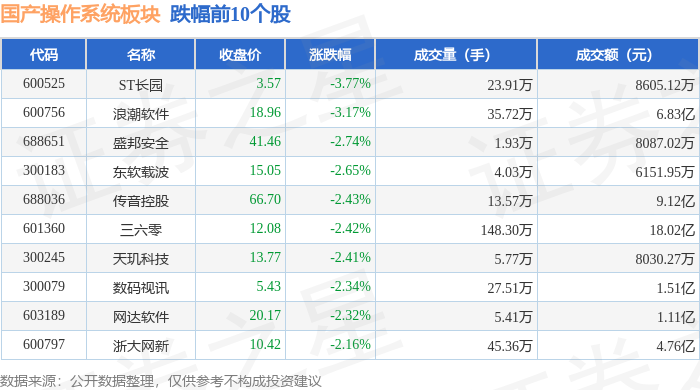 证券之星消息,12月9日国产操作系统板块较上一交易日下跌0.17%,ST长园领跌。当日上证指数报收于3909.52,下跌0.37%。深证成指报收于13277.36,下跌0.39%。国产操作系统板块个股涨跌见下表:
