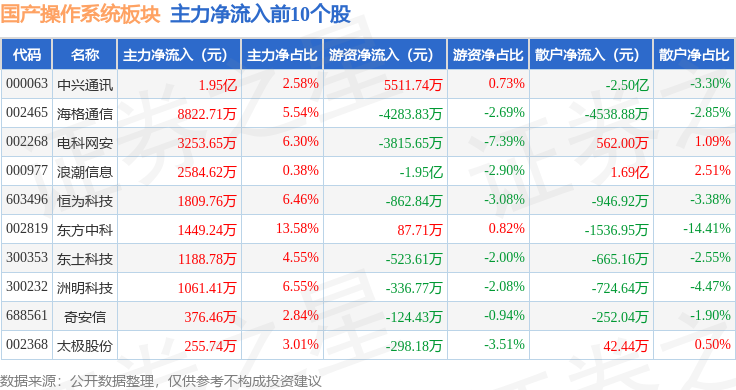 从资金流向上来看,当日国产操作系统板块主力资金净流出12.83亿元,游资资金净流入7688.77万元,散户资金净流入12.06亿元。国产操作系统板块个股资金流向见下表: