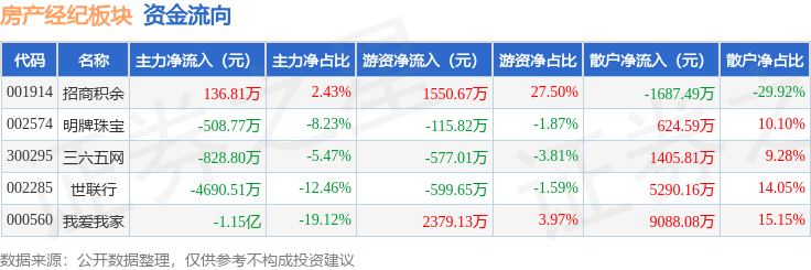 从资金流向上来看,当日房产经纪板块主力资金净流出1.74亿元,游资资金净流入2637.33万元,散户资金净流入1.47亿元。房产经纪板块个股资金流向见下表: