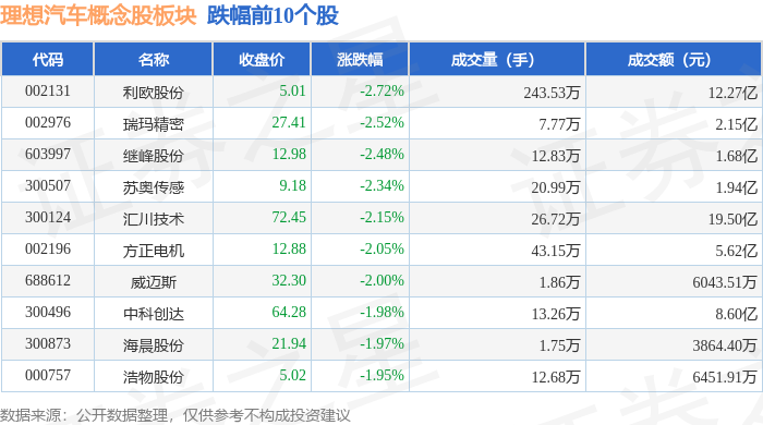 从资金流向上来看,当日理想汽车概念股板块主力资金净流出11.2亿元,游资资金净流入3.19亿元,散户资金净流入8.0亿元。理想汽车概念股板块个股资金流向见下表: