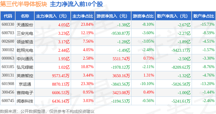 从资金流向上来看,当日第三代半导体板块主力资金净流出32.6亿元,游资资金净流入7.02亿元,散户资金净流入25.58亿元。第三代半导体板块个股资金流向见下表:
