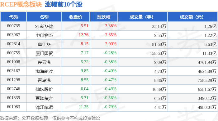 证券之星消息,12月9日RCEP概念板块较上一交易日下跌1.15%,高乐股份领跌。当日上证指数报收于3909.52,下跌0.37%。深证成指报收于13277.36,下跌0.39%。RCEP概念板块个股涨跌见下表: