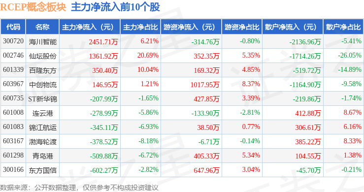 从资金流向上来看,当日RCEP概念板块主力资金净流出3.59亿元,游资资金净流入2.2亿元,散户资金净流入1.39亿元。RCEP概念板块个股资金流向见下表: