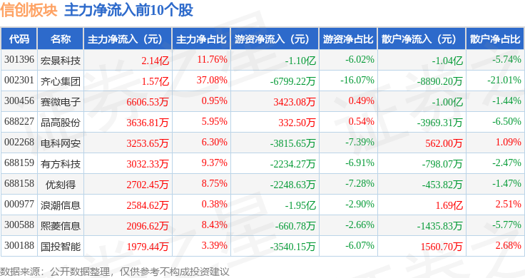 从资金流向上来看,当日信创板块主力资金净流出61.35亿元,游资资金净流入4.72亿元,散户资金净流入56.62亿元。信创板块个股资金流向见下表: