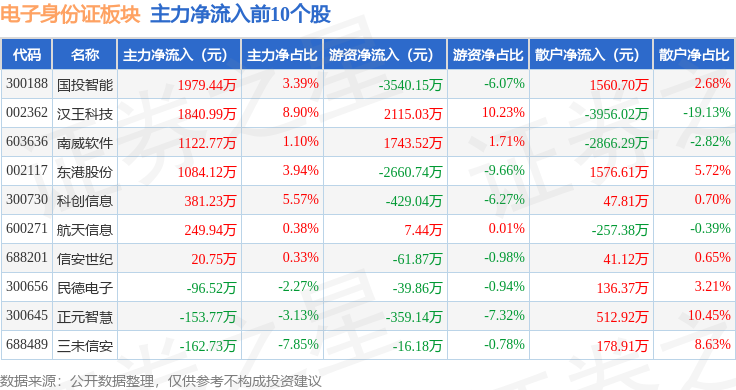 从资金流向上来看,当日电子身份证板块主力资金净流出3.67亿元,游资资金净流入6492.54万元,散户资金净流入3.02亿元。电子身份证板块个股资金流向见下表: