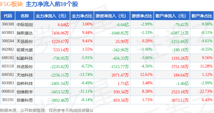 从资金流向上来看,当日F5G板块主力资金净流出2.84亿元,游资资金净流出3.85亿元,散户资金净流入6.69亿元。F5G板块个股资金流向见下表: