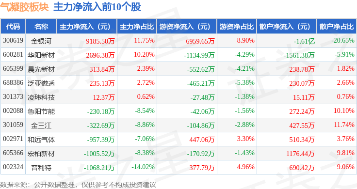 从资金流向上来看,当日气凝胶板块主力资金净流出2.12亿元,游资资金净流入7770.24万元,散户资金净流入1.34亿元。气凝胶板块个股资金流向见下表: