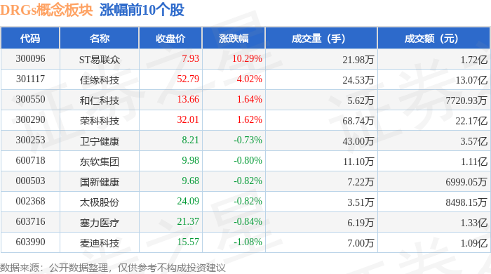 证券之星消息,12月9日DRGs概念板块较上一交易日下跌0.48%,思创医惠领跌。当日上证指数报收于3909.52,下跌0.37%。深证成指报收于13277.36,下跌0.39%。DRGs概念板块个股涨跌见下表: