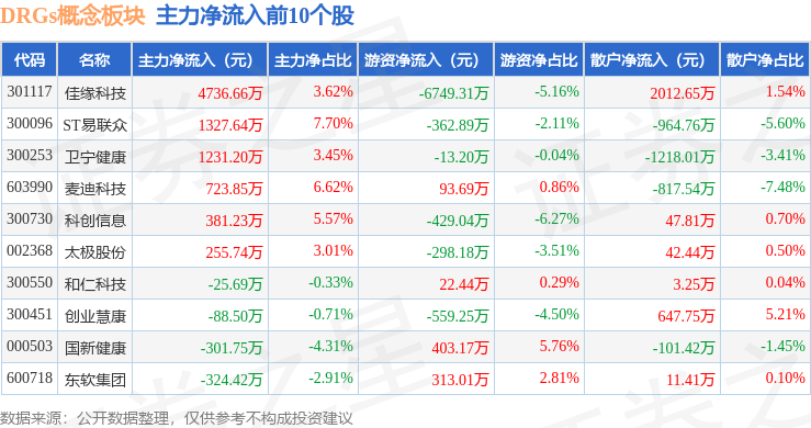 从资金流向上来看,当日DRGs概念板块主力资金净流出3.13亿元,游资资金净流出4893.41万元,散户资金净流入3.62亿元。DRGs概念板块个股资金流向见下表: