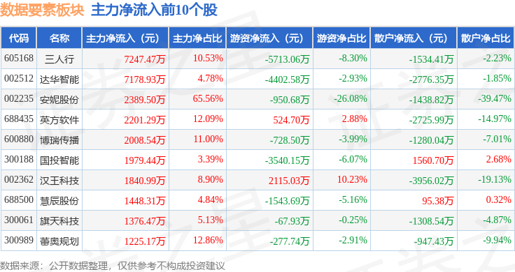 从资金流向上来看,当日数据要素板块主力资金净流出21.76亿元,游资资金净流入2276.78万元,散户资金净流入21.53亿元。数据要素板块个股资金流向见下表: