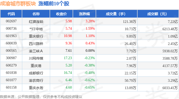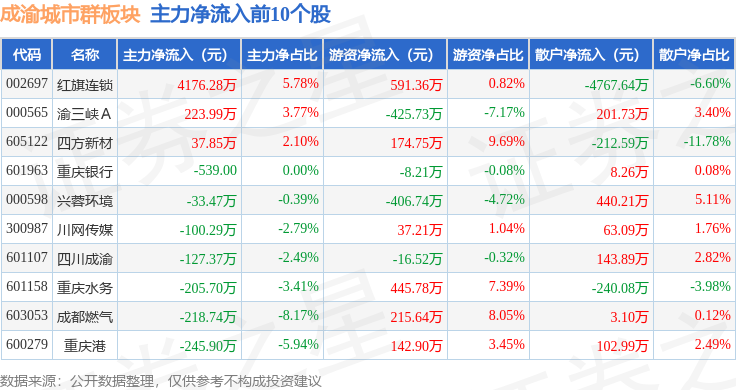 从资金流向上来看,当日成渝城市群板块主力资金净流出2.1亿元,游资资金净流入1.26亿元,散户资金净流入8356.13万元。成渝城市群板块个股资金流向见下表: