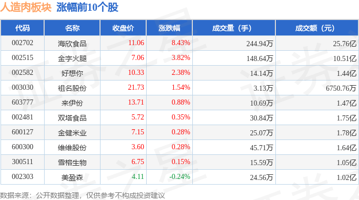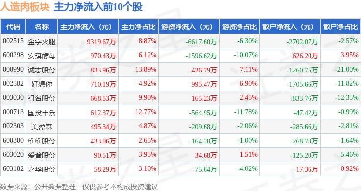 从资金流向上来看,当日人造肉板块主力资金净流出1.3亿元,游资资金净流出33.61万元,散户资金净流入1.3亿元。人造肉板块个股资金流向见下表:
