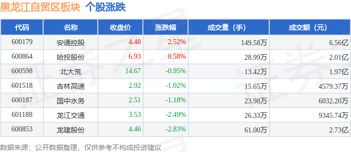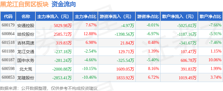 从资金流向上来看,当日黑龙江自贸区板块主力资金净流入2562.82万元,游资资金净流入1865.46万元,散户资金净流出4428.28万元。黑龙江自贸区板块个股资金流向见下表: