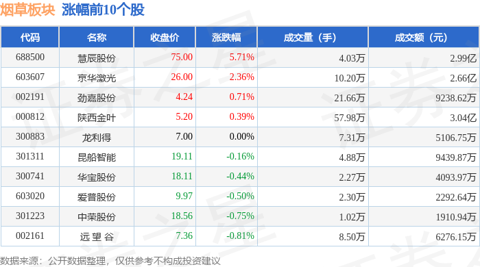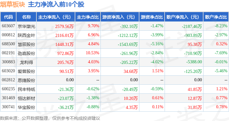 从资金流向上来看,当日烟草板块主力资金净流出6.1亿元,游资资金净流入6318.25万元,散户资金净流入5.47亿元。烟草板块个股资金流向见下表: