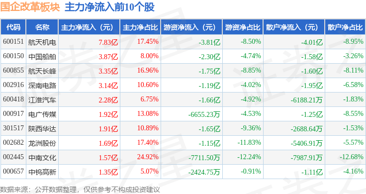 从资金流向上来看,当日国企改革板块主力资金净流出169.8亿元,游资资金净流入34.96亿元,散户资金净流入134.84亿元。国企改革板块个股资金流向见下表: