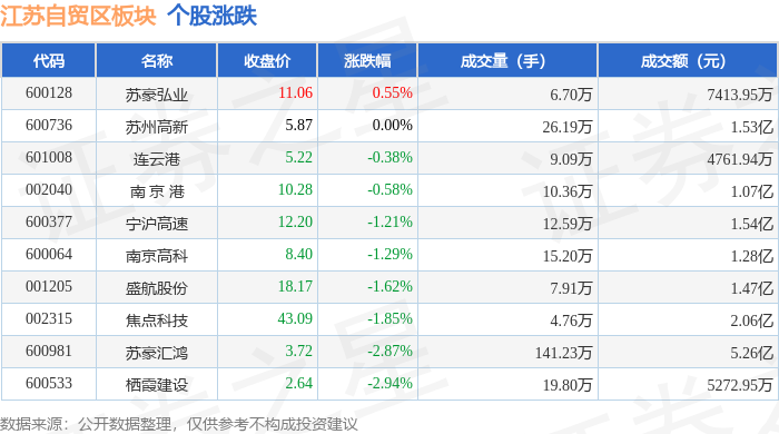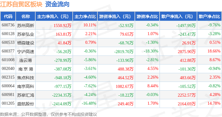从资金流向上来看,当日江苏自贸区板块主力资金净流出5539.45万元,游资资金净流出728.89万元,散户资金净流入6268.34万元。江苏自贸区板块个股资金流向见下表: